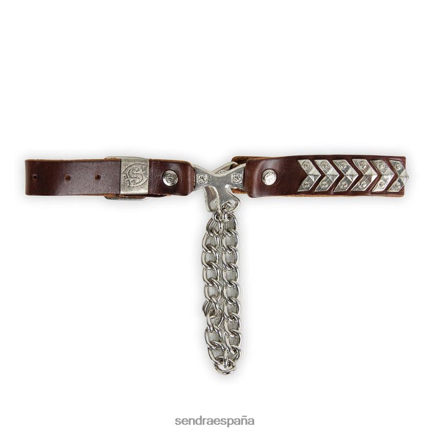 Arnés marrón oscuro con una colección de remaches plateados.